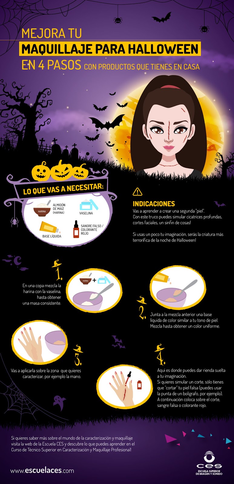 Para hacer heridas en brazos, frente, piernas… puedes seguir los pasos dela imagen y te quedará un maquillaje para halloween perfecto.